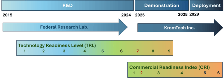 The DRC process advanced from concept (2017) to TRL-7 demonstration (2025) and is entering pilot-scale commercialization under KromTech Inc.