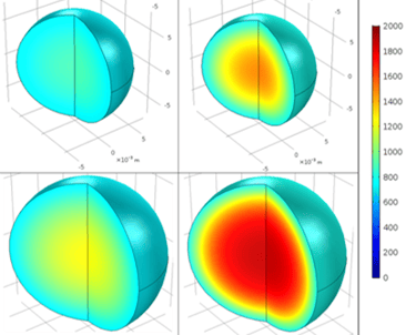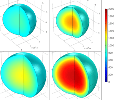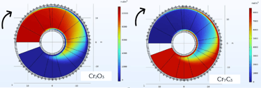 Concentration of Cr2O3 in a single pellet measuring 15 mm (top) and 25 mm (bottom) with effective thermal conductivities of 0.1 (right) and 0.5 W/(m K) (left)